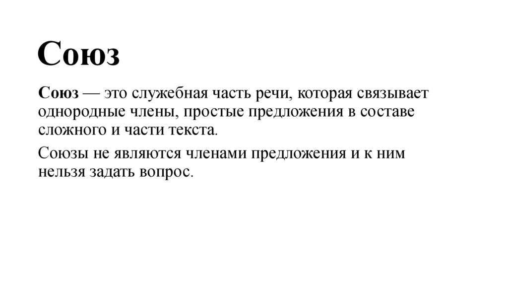Союз — это служебная часть речи, которая связываетоднородные члены, простые предложения в составе