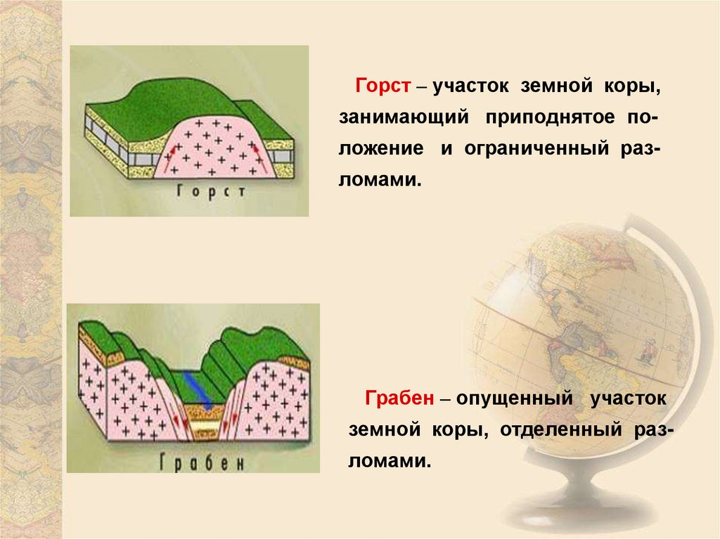 Горст – участок земной коры,занимающий приподнятое положение и ограниченный разломами.