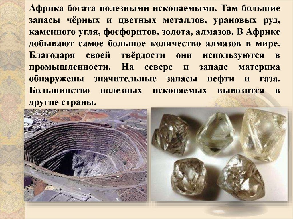 Африка богата полезными ископаемыми. Там большиезапасы чёрных и цветных металлов, урановых руд,