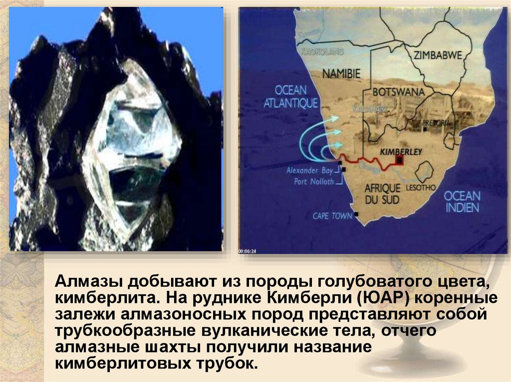 Алмазы добывают из породы голубоватого цвета,кимберлита. На руднике Кимберли (ЮАР) коренные