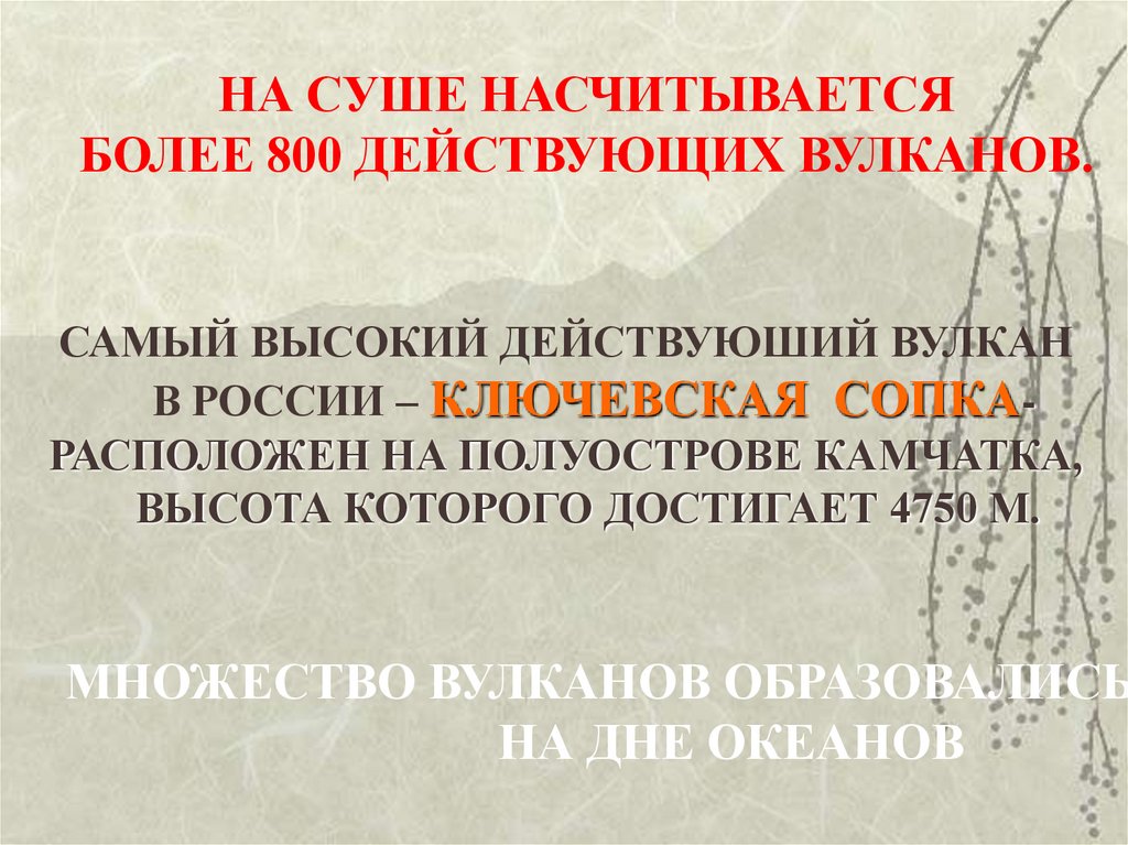 НА СУШЕ НАСЧИТЫВАЕТСЯБОЛЕЕ 800 ДЕЙСТВУЮЩИХ ВУЛКАНОВ.