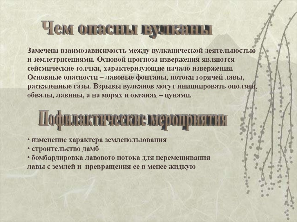 Замечена взаимозависимость между вулканической деятельностьюи землетрясениями. Основой прогноза извержения являются