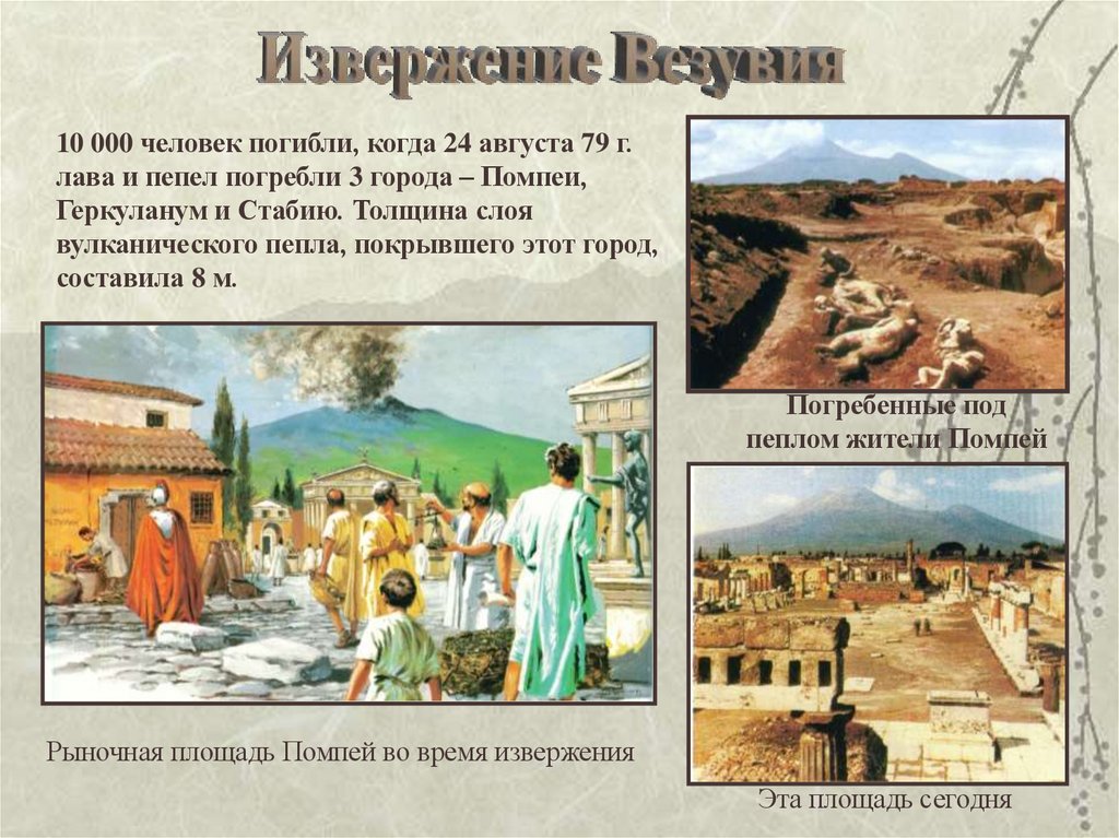 10 000 человек погибли, когда 24 августа 79 г.лава и пепел погребли 3 города – Помпеи,