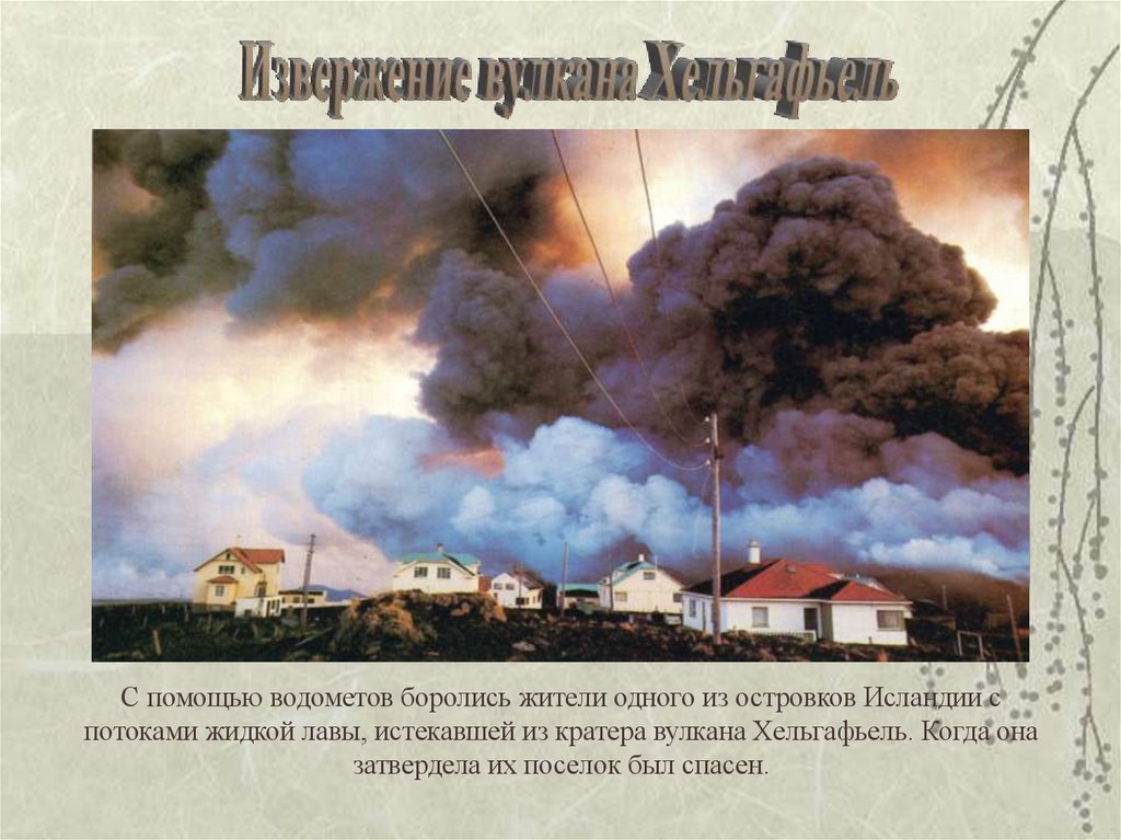 С помощью водометов боролись жители одного из островков Исландии спотоками жидкой лавы, истекавшей из кратера вулкана Хельгафьель. Когда она
