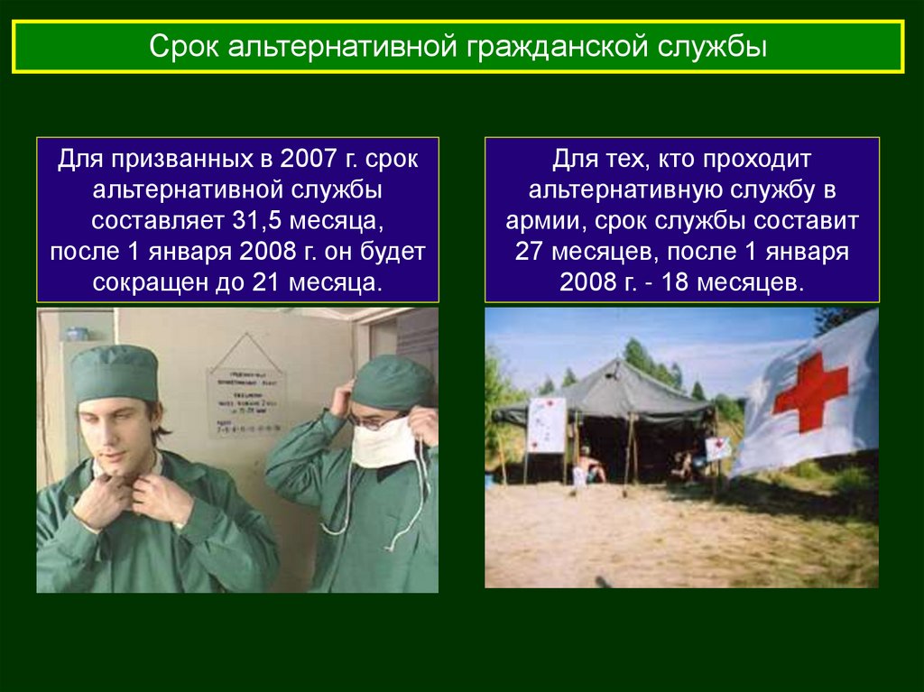Срок альтернативной гражданской службыДля призванных в 2007 г. срок