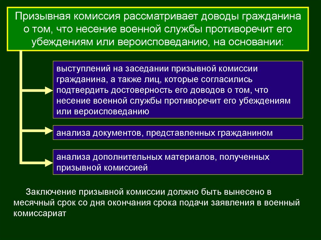 Призывная комиссия рассматривает доводы гражданинао том, что несение военной службы противоречит его