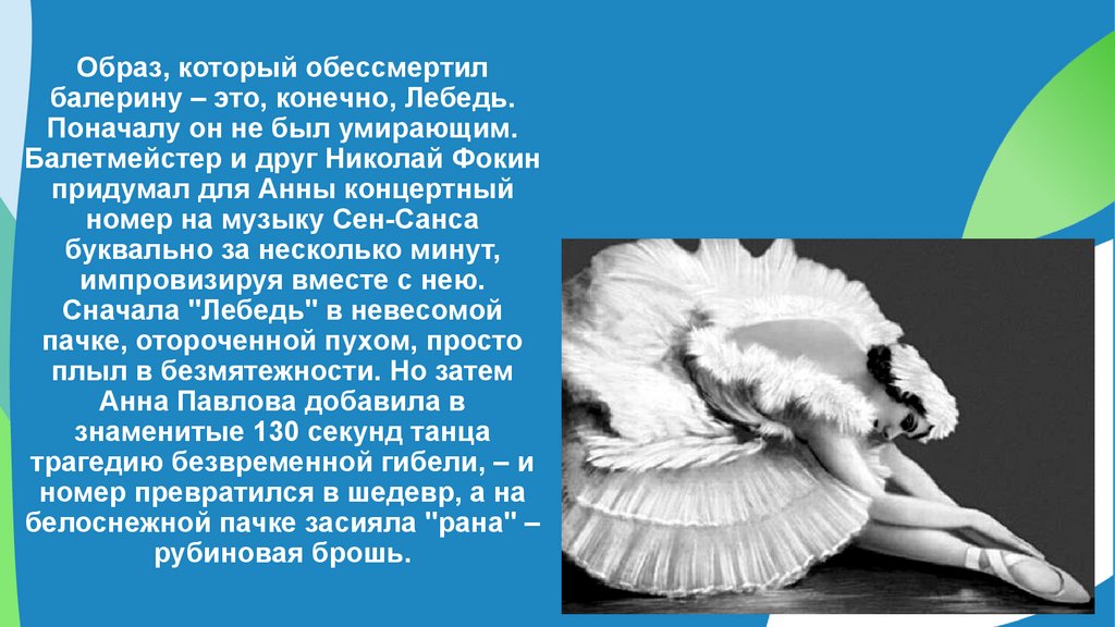 Образ, который обессмертилбалерину – это, конечно, Лебедь.