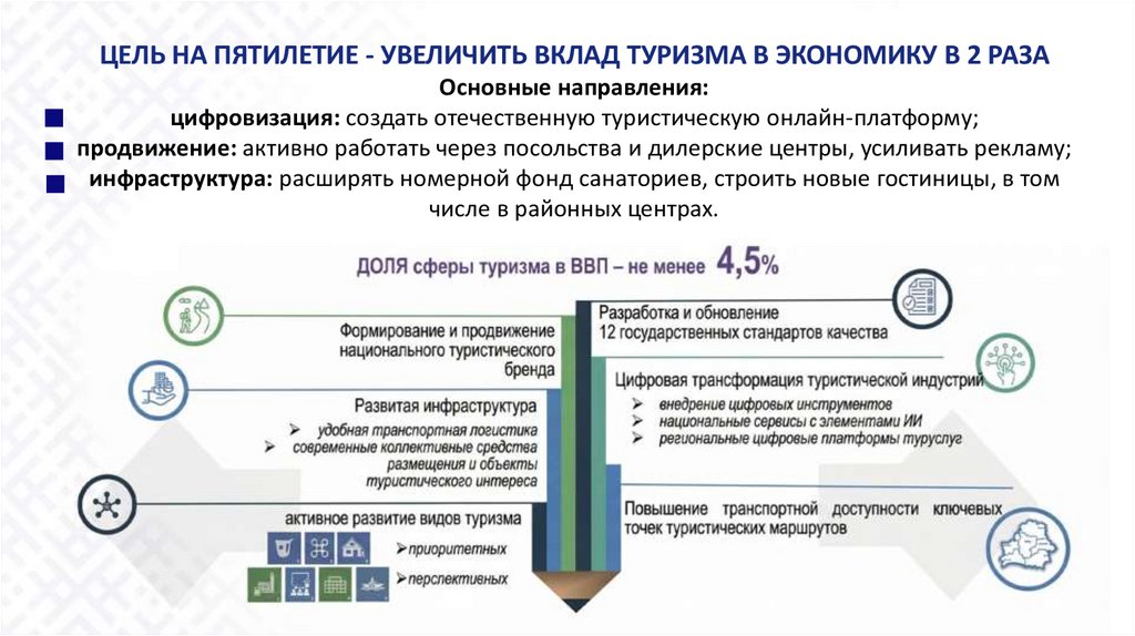 ЦЕЛЬ НА ПЯТИЛЕТИЕ - УВЕЛИЧИТЬ ВКЛАД ТУРИЗМА В ЭКОНОМИКУ В 2 РАЗАОсновные направления:
