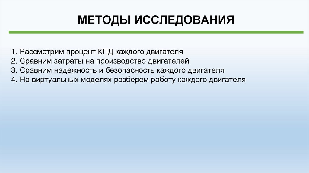 МЕТОДЫ ИССЛЕДОВАНИЯ1. Рассмотрим процент КПД каждого двигателя