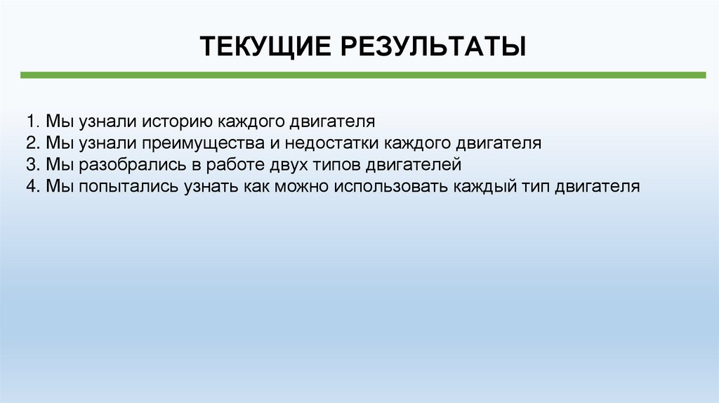 ТЕКУЩИЕ РЕЗУЛЬТАТЫ1. Мы узнали историю каждого двигателя
