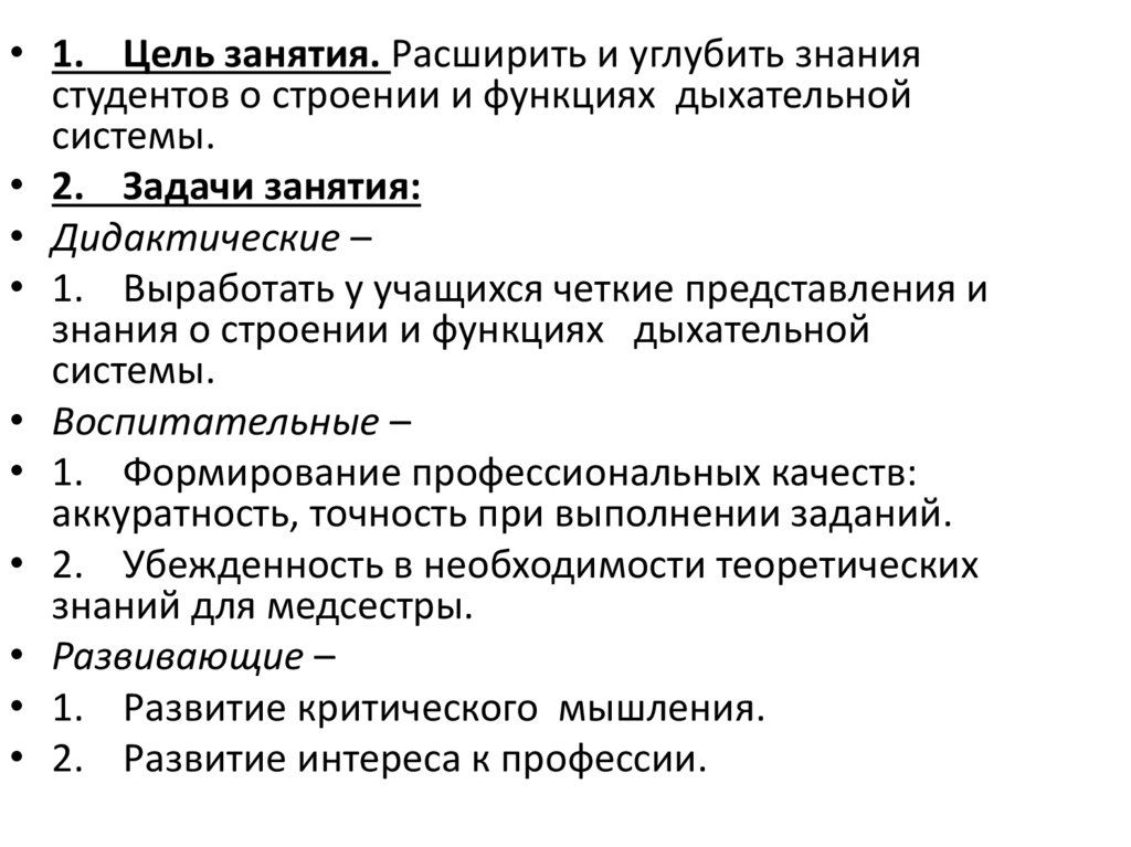 • 1. Цель занятия. Расширить и углубить знаниястудентов о строении и функциях дыхательной