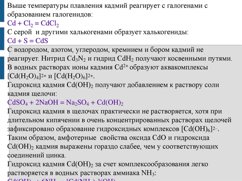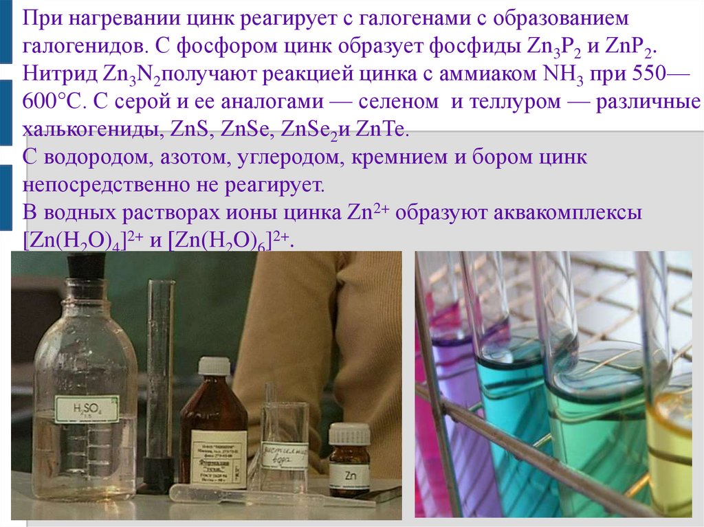 При нагревании цинк реагирует с галогенами с образованиемгалогенидов. С фосфором цинк образует фосфиды Zn3P2 и ZnP2.