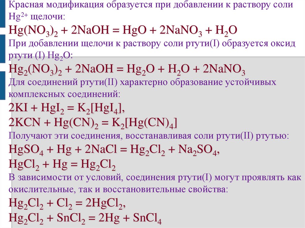 Красная модификация образуется при добавлении к раствору солиHg2+ щелочи: