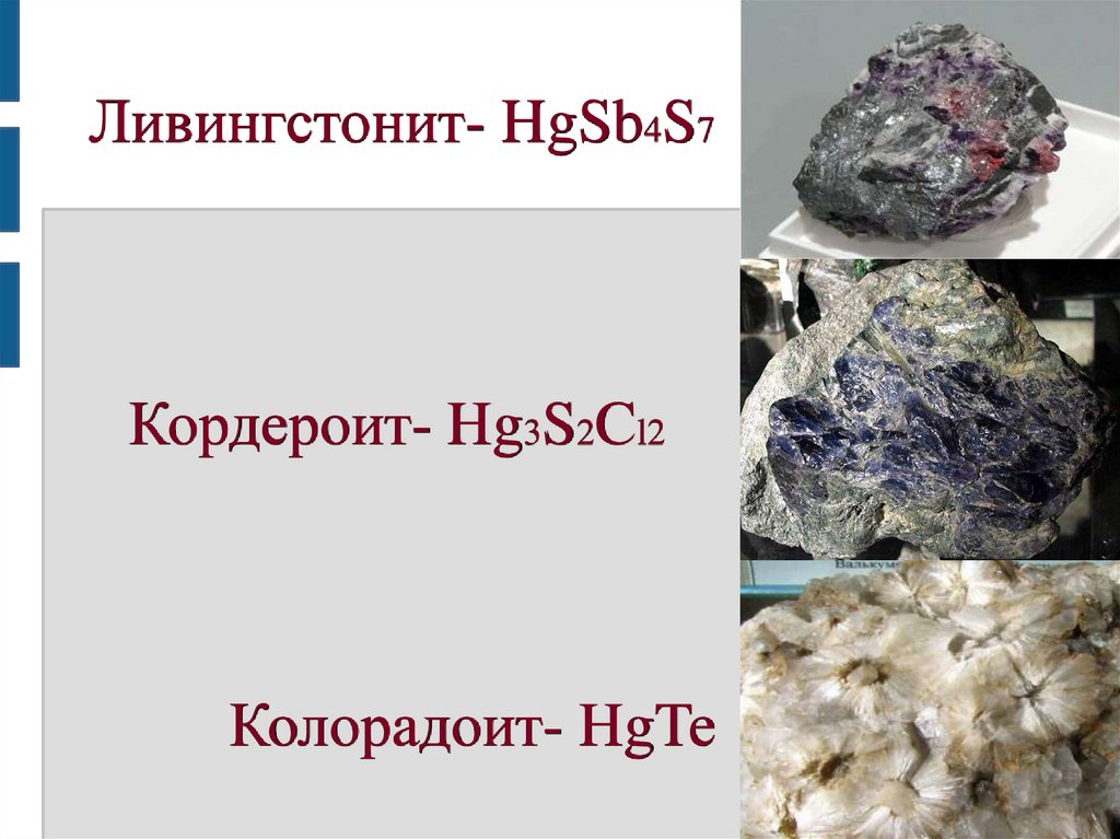Ливингстонит- HgSb4S7Кордероит- Hg3S2Cl2