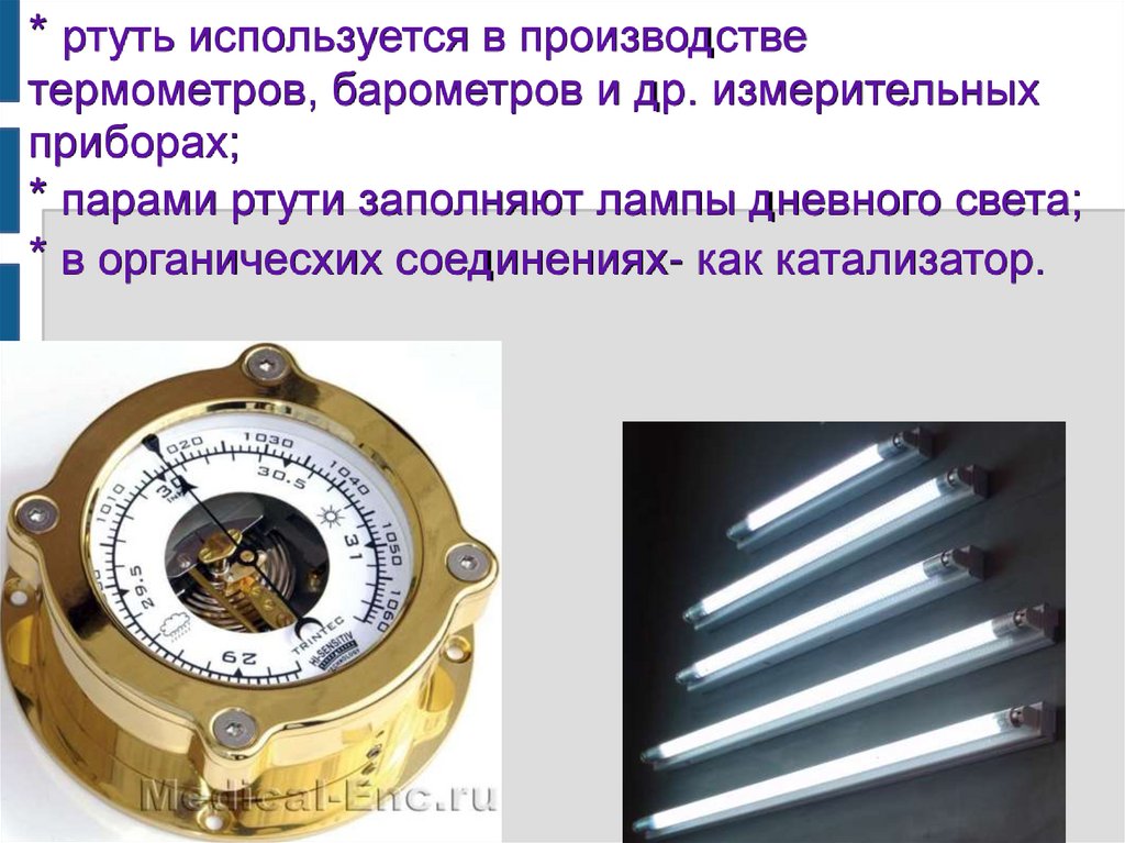 * ртуть используется в производстветермометров, барометров и др. измерительных