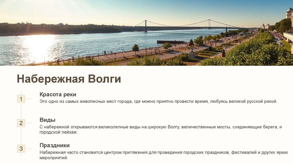 С набережной открываются великолепные виды на широкую Волгу, величественные мосты, соединяющие берега, и