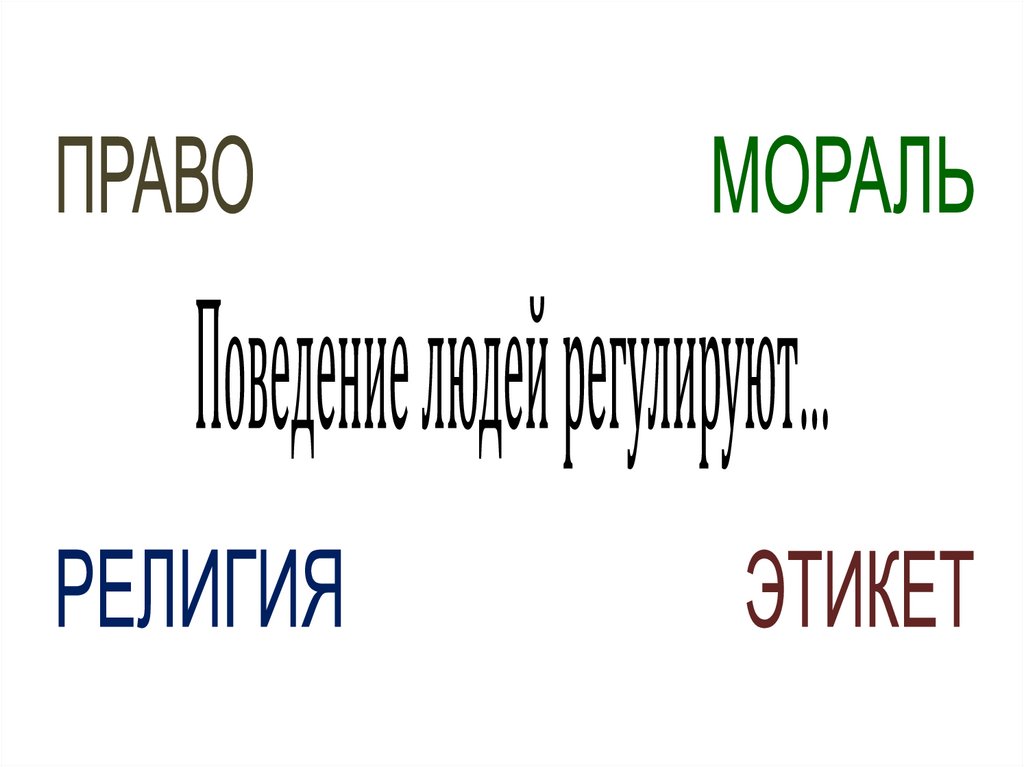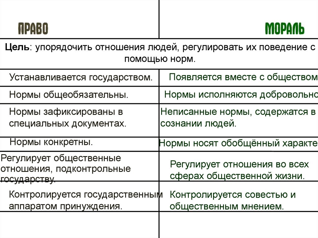 Цель: упорядочить отношения людей, регулировать их поведение спомощью норм.