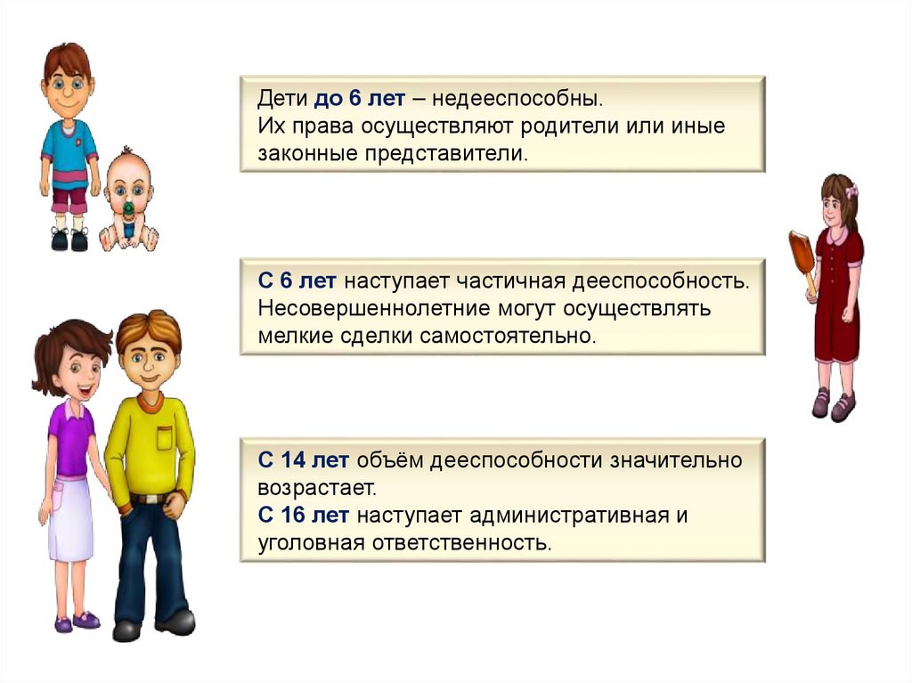 Дети до 6 лет – недееспособны.Их права осуществляют родители или иные