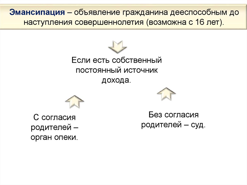 Эмансипация – объявление гражданина дееспособным донаступления совершеннолетия (возможна с 16 лет).