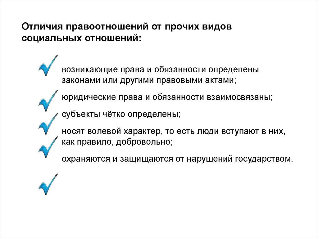 Отличия правоотношений от прочих видовсоциальных отношений: