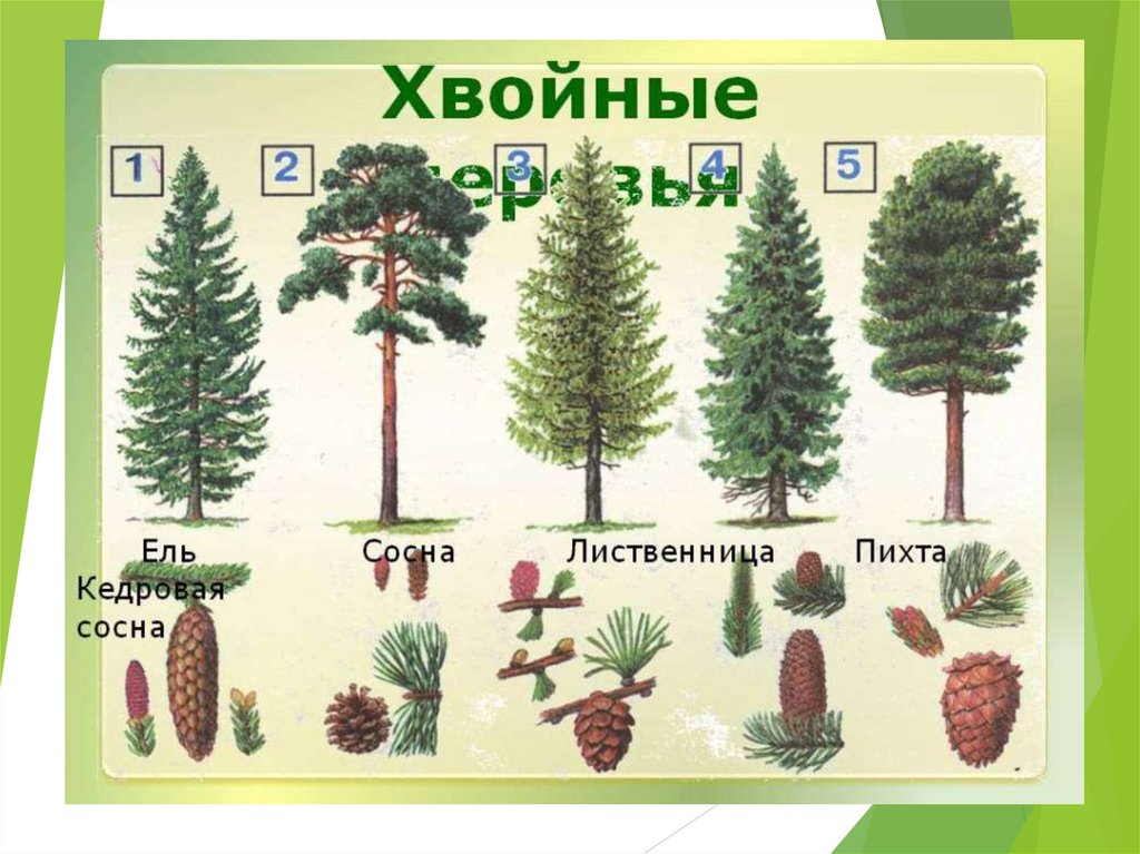 Деревья с листьями в виде иголочек называются хвойными Хвоя – это множество зелёных игл, покрывающих ветки деревьев.
