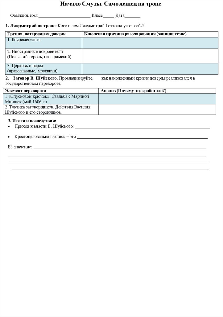 Начало Смуты. Самозванец на тронеФамилия, имя _______________________ Класс_____ Дата_______