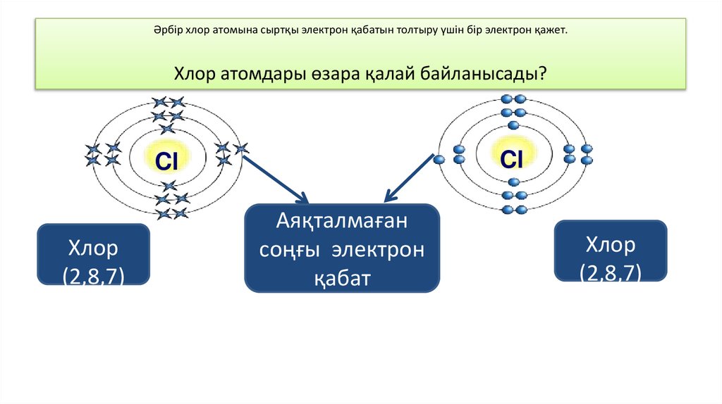 Әрбір хлор атомына сыртқы электрон қабатын толтыру үшін бір электрон қажет.Хлор атомдары өзара қалай байланысады?