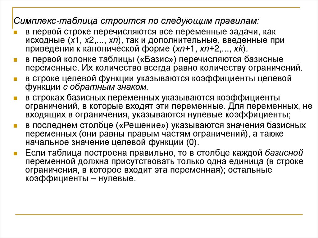 Симплекс-таблица строится по следующим правилам:в первой строке перечисляются все переменные задачи, как