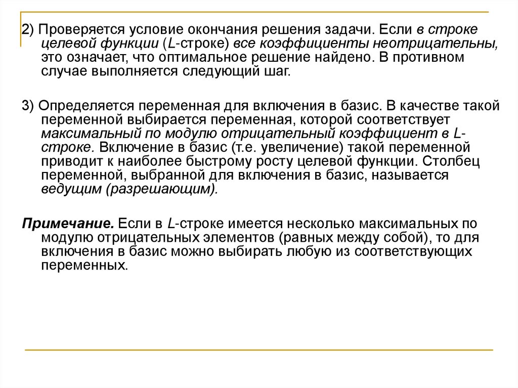 2) Проверяется условие окончания решения задачи. Если в строкецелевой функции (L-строке) все коэффициенты неотрицательны,