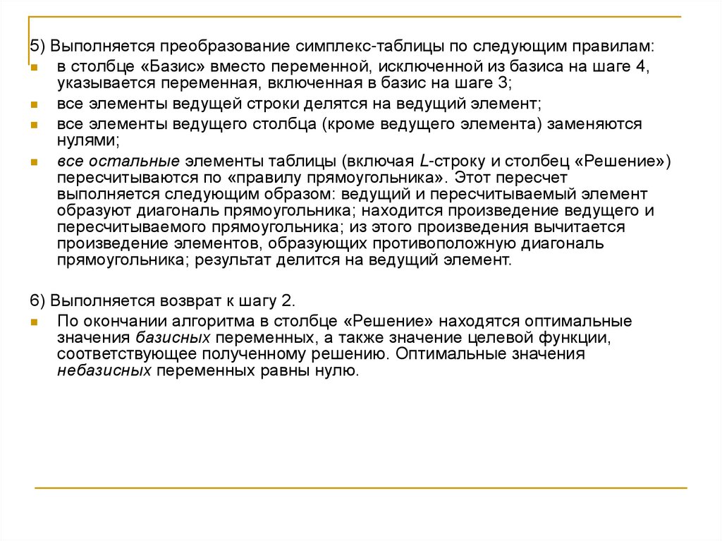 5) Выполняется преобразование симплекс-таблицы по следующим правилам:в столбце «Базис» вместо переменной, исключенной из базиса на шаге 4,