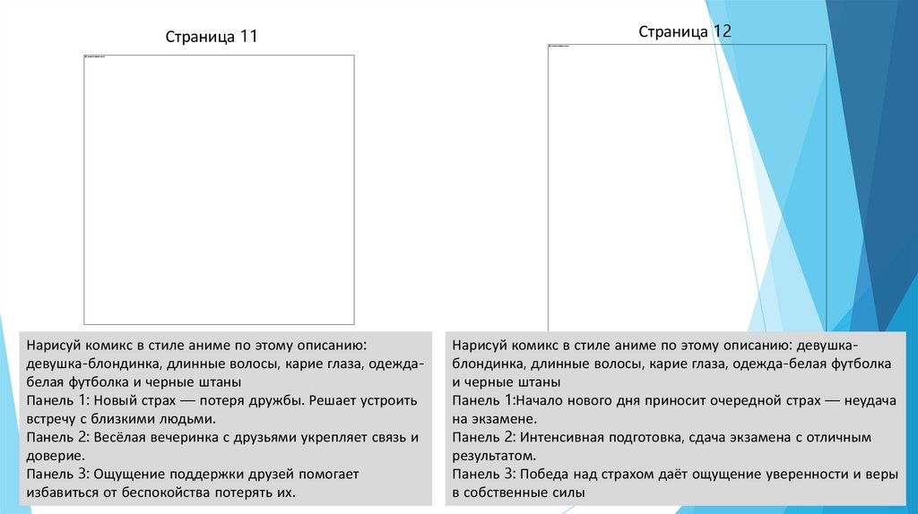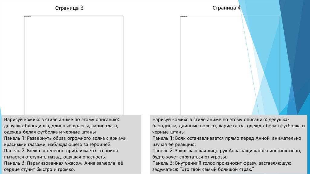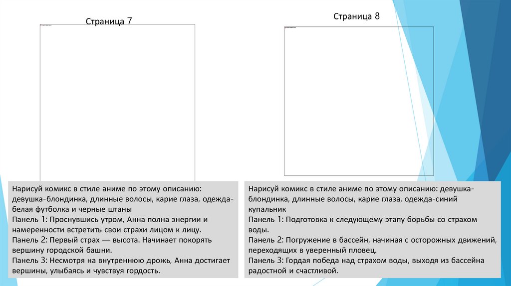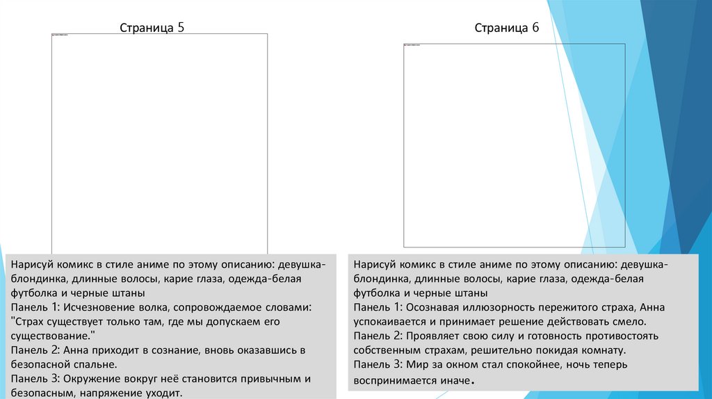 Страница 5Нарисуй комикс в стиле аниме по этому описанию: девушкаблондинка, длинные волосы, карие глаза, одежда-белая