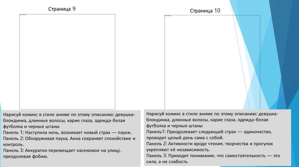 Страница 9Нарисуй комикс в стиле аниме по этому описанию: девушкаблондинка, длинные волосы, карие глаза, одежда-белая