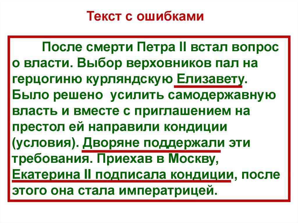 Текст с ошибкамиПосле смерти Петра ll встал вопрос