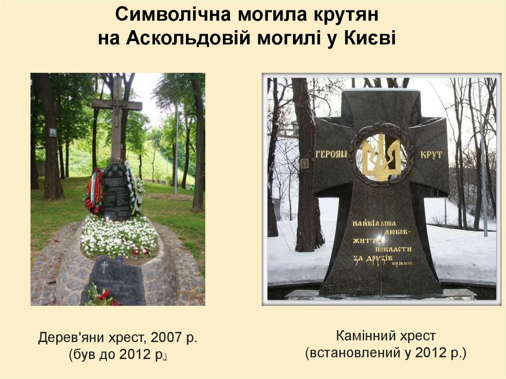 Станція Крути.Символічна могила (ліворуч) і сучасний меморіал загиблим