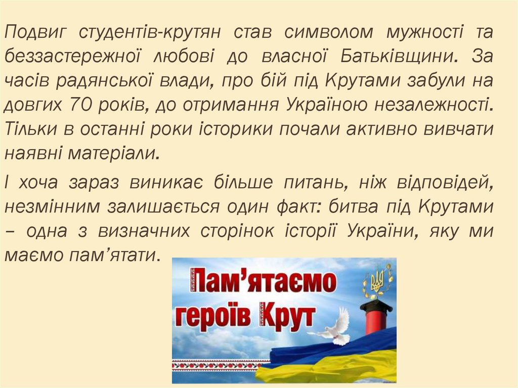 Подвиг студентів-крутян став символом мужності табеззастережної любові до власної Батьківщини. За