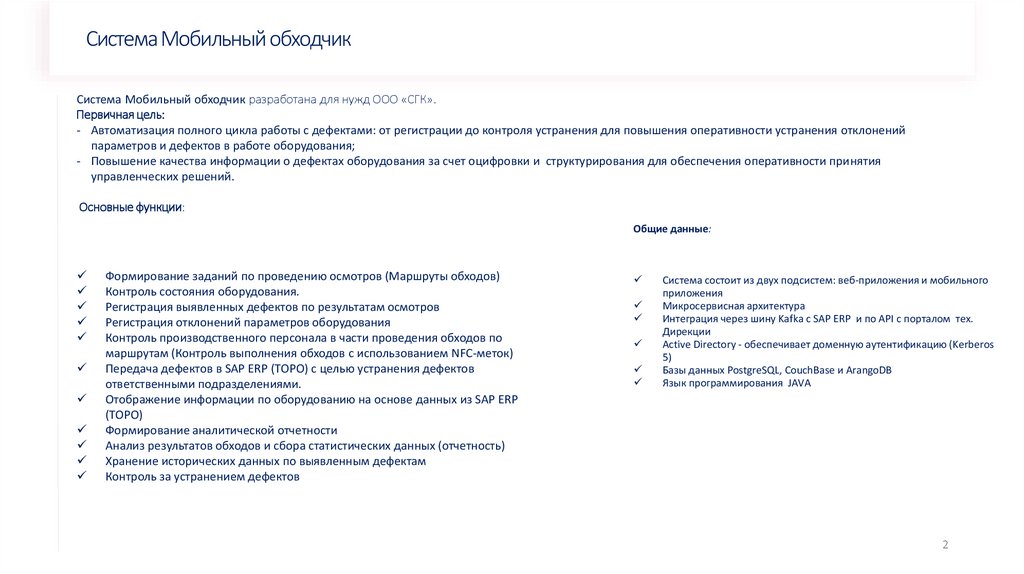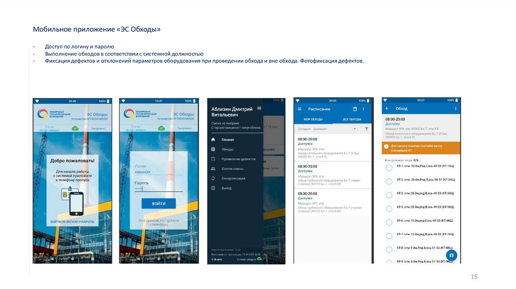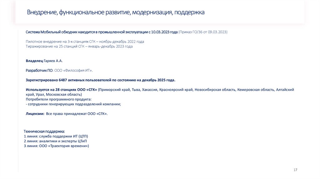 Внедрение, функциональное развитие, модернизация, поддержкаСистема Мобильный обходчик находится в промышленной эксплуатации с 10.03.2023 года (Приказ ГО/36 от 09.03.2023)