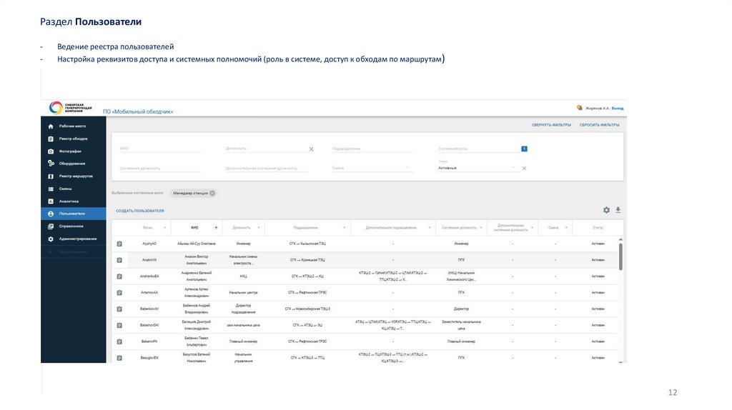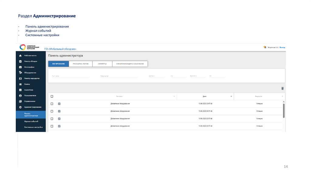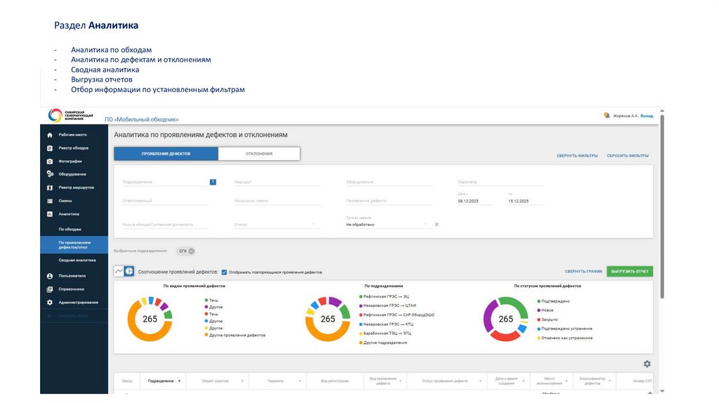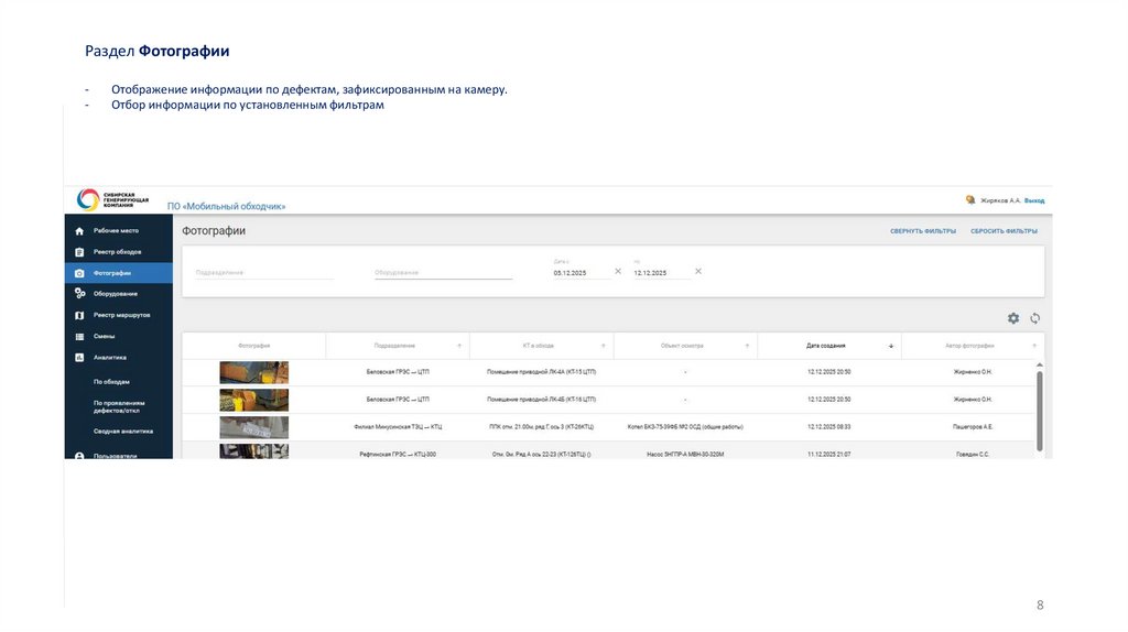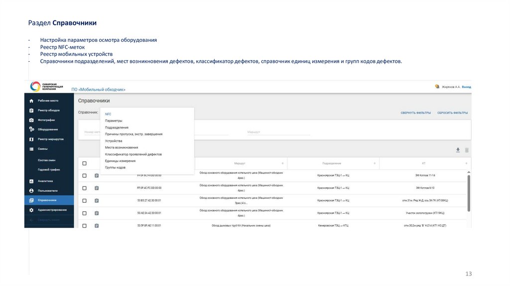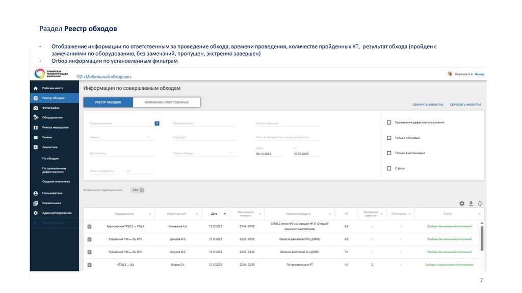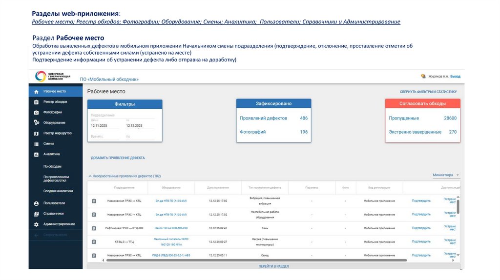 Разделы web-приложения:Рабочее место; Реестр обходов; Фотографии; Оборудование; Смены; Аналитика; Пользователи; Справочники и Администрирование