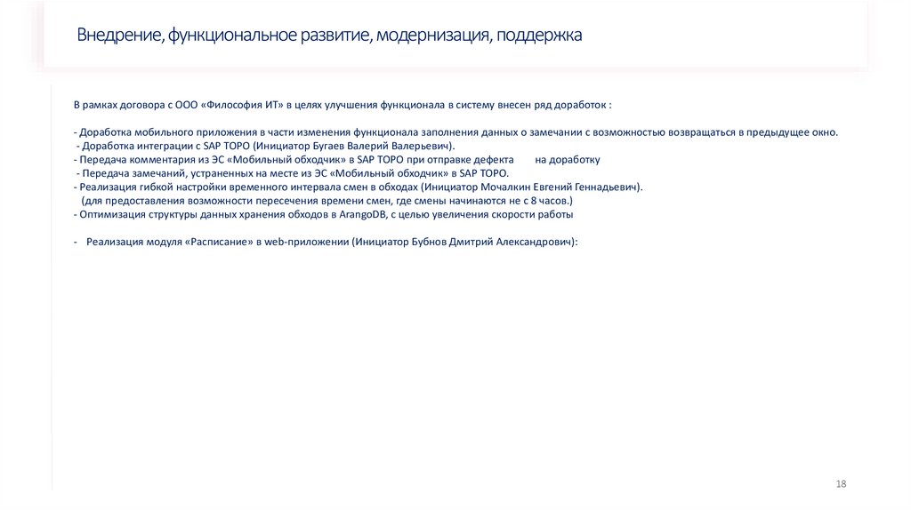 Внедрение, функциональное развитие, модернизация, поддержкаВ рамках договора с ООО «Философия ИТ» в целях улучшения функционала в систему внесен ряд доработок :