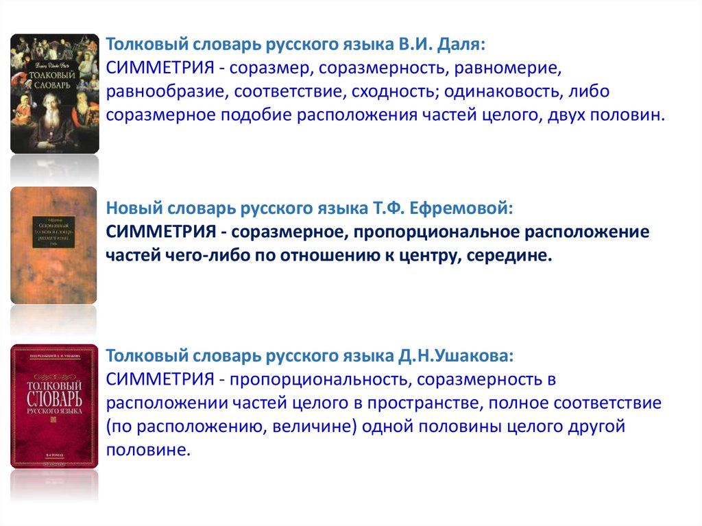 Толковый словарь русского языка В.И. Даля:СИММЕТРИЯ - соразмер, соразмерность, равномерие,