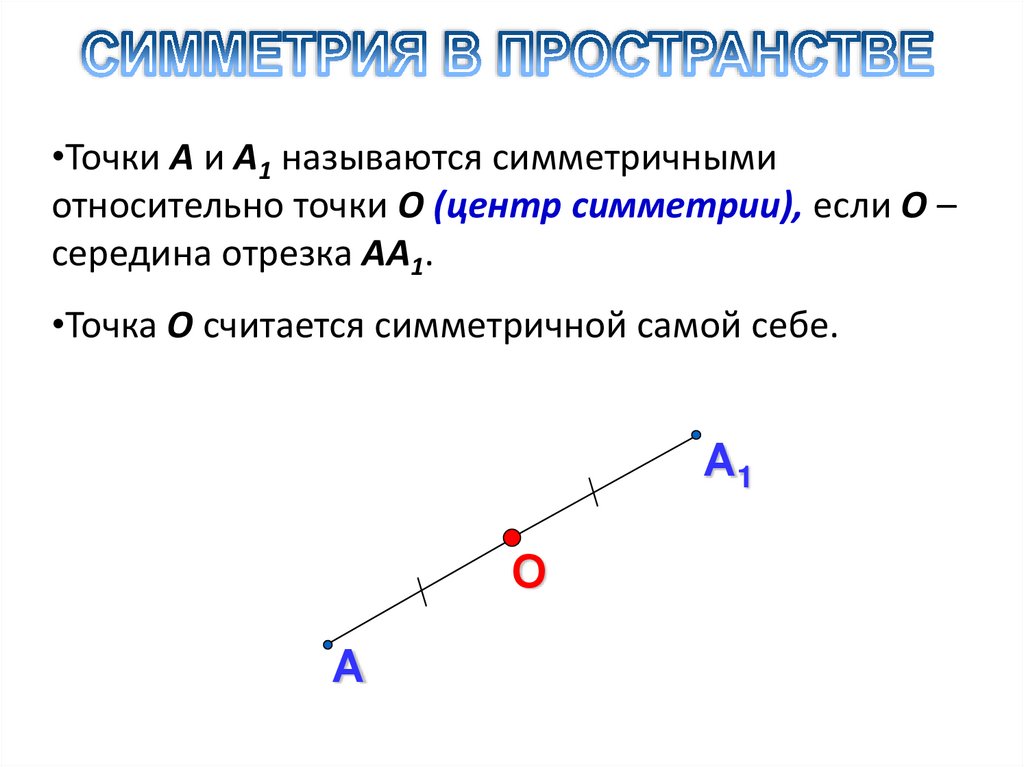 •Точки А и А1 называются симметричнымиотносительно точки О (центр симметрии), если О –