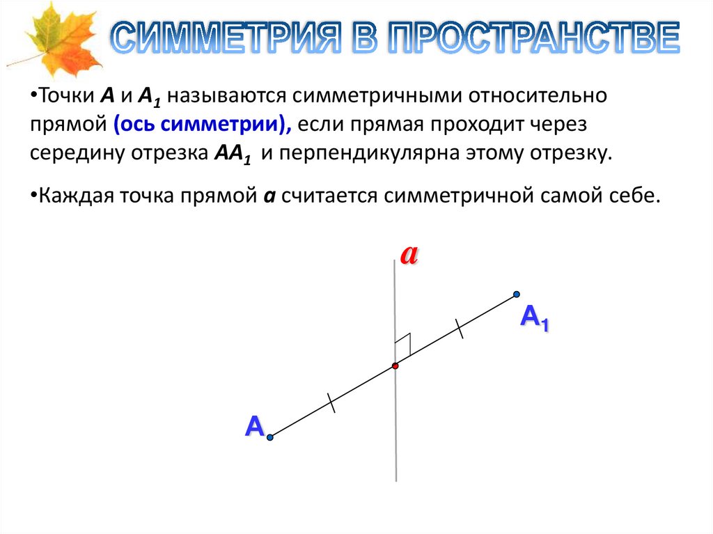 •Точки А и А1 называются симметричными относительнопрямой (ось симметрии), если прямая проходит через