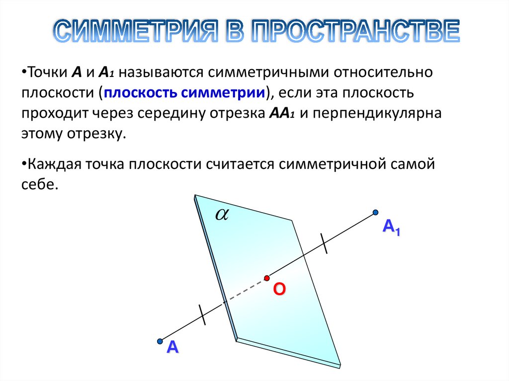 •Точки А и А1 называются симметричными относительноплоскости (плоскость симметрии), если эта плоскость