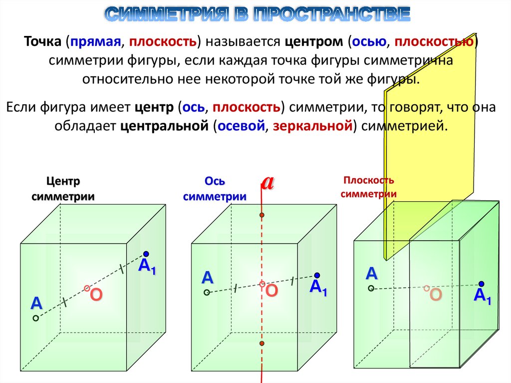 Точка (прямая, плоскость) называется центром (осью, плоскостью)симметрии фигуры, если каждая точка фигуры симметрична