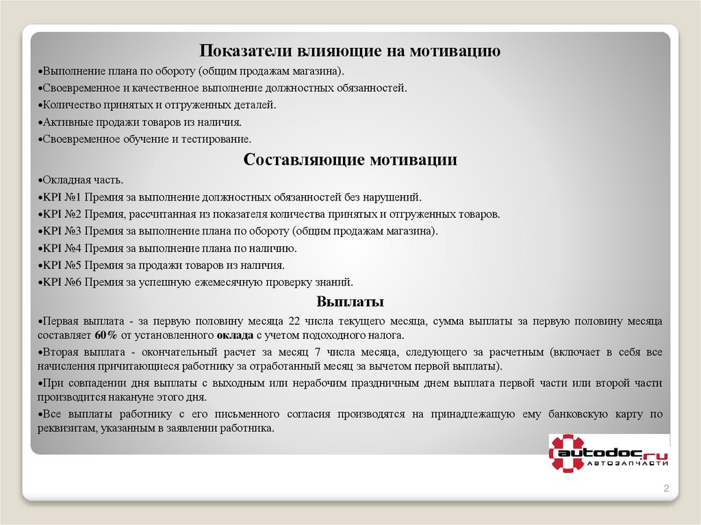 Показатели влияющие на мотивациюВыполнение плана по обороту (общим продажам магазина).