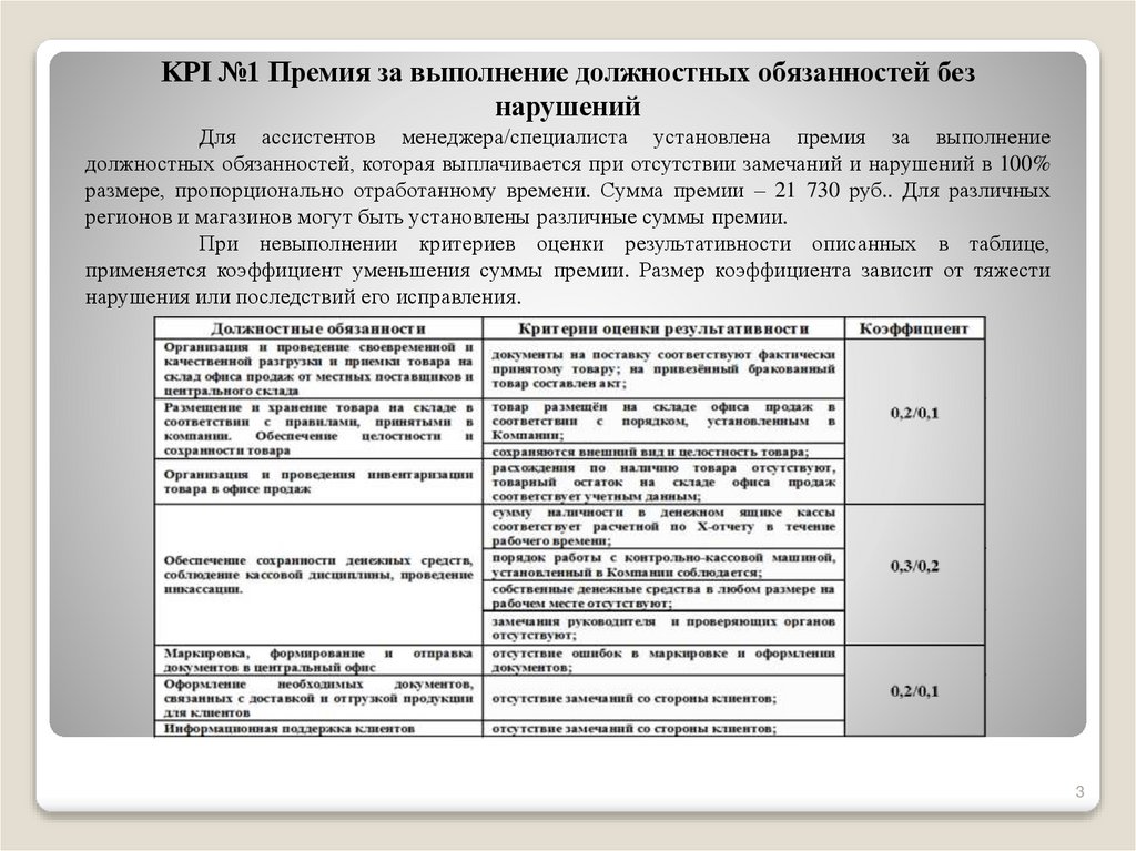 KPI №1 Премия за выполнение должностных обязанностей безнарушений