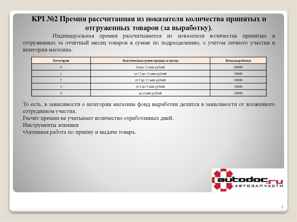 KPI №2 Премия рассчитанная из показателя количества принятых иотгруженных товаров (за выработку).