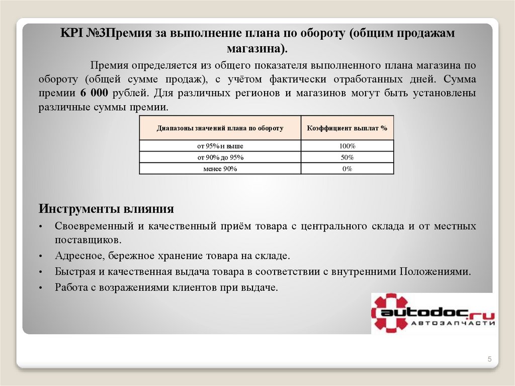 KPI №3Премия за выполнение плана по обороту (общим продажаммагазина).