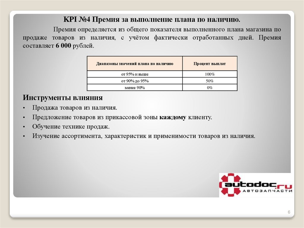 KPI №4 Премия за выполнение плана по наличию.