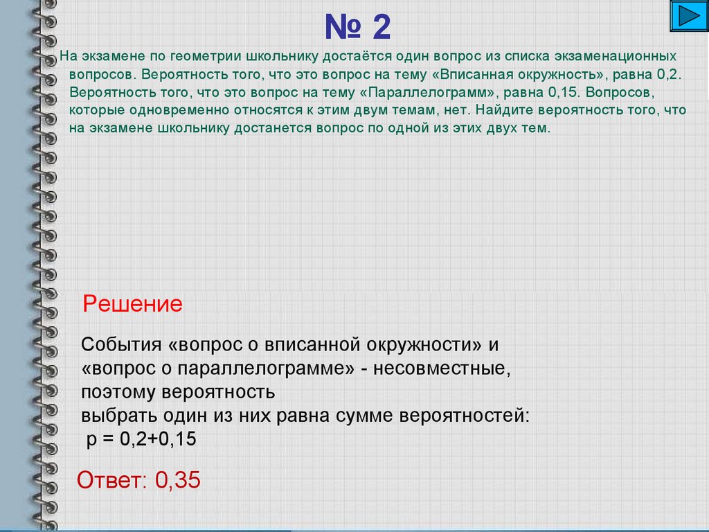 №2На экзамене по геометрии школьнику достаётся один вопрос из списка экзаменационных