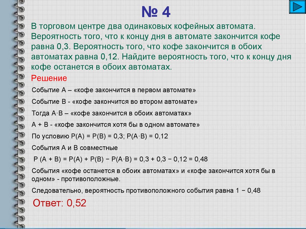 Следовательно, вероятность противоположного события равна 1 − 0,48